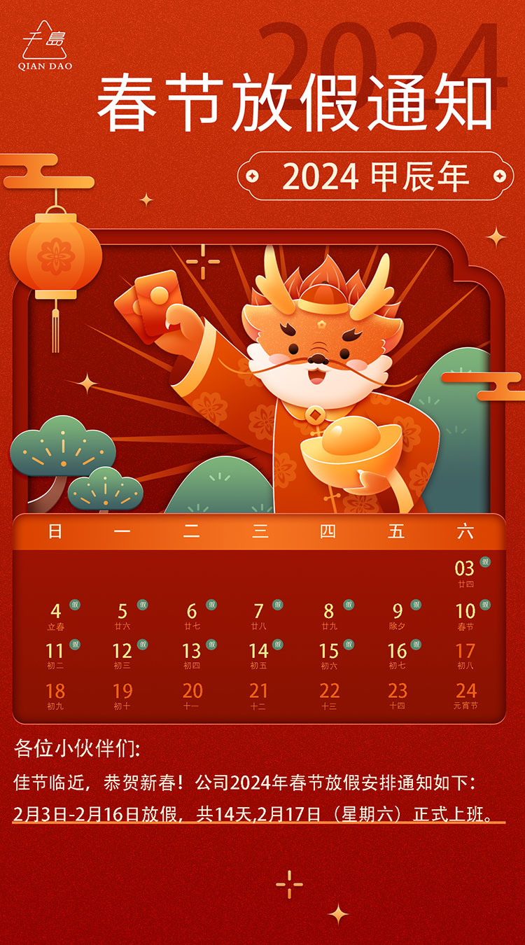 結(jié)合本公司實(shí)際生產(chǎn)需要和國(guó)家法定節(jié)假日,千島機(jī)械2024年春節(jié)放假時(shí)間為:2月3日至2月16日,共計(jì)14天,特此通知