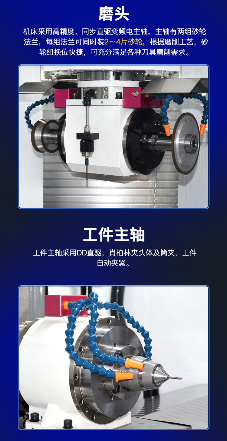 機(jī)床采用高精度、同步直驅(qū)變頻電主軸,主軸有兩組砂輪法蘭,每組法蘭可同時裝2~4片砂輪,根據(jù)磨削工藝,砂輪組換位快捷,可充分滿足各種刀具磨削需求。