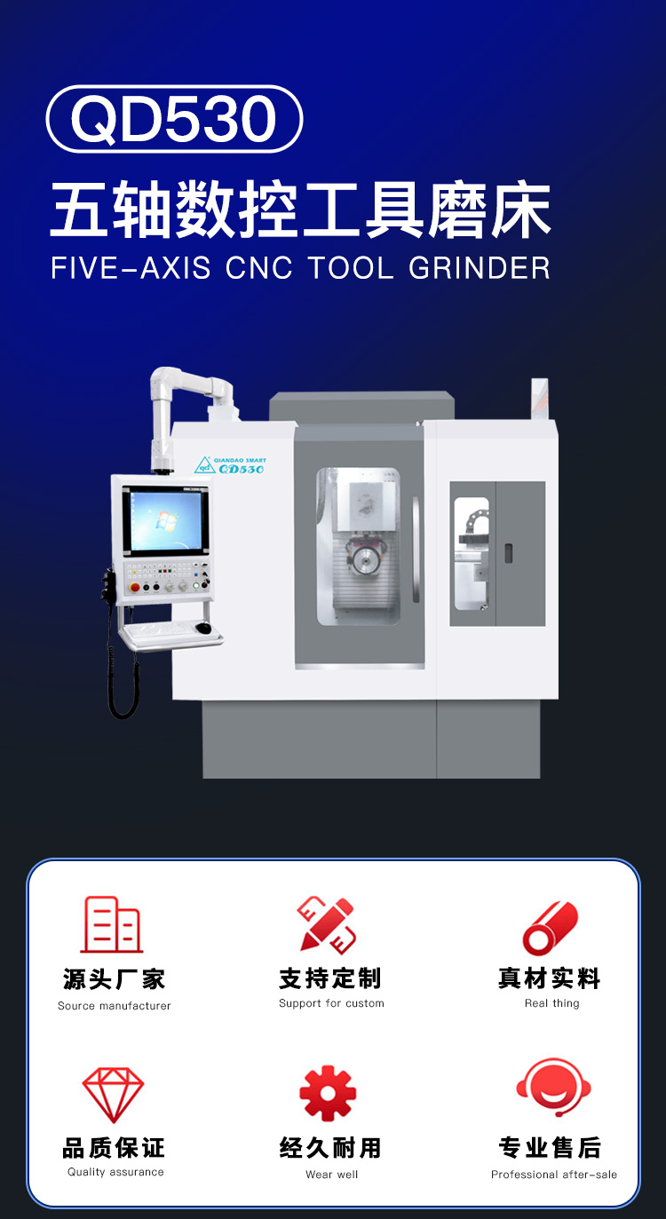 QD530是千島公司新研發(fā)的五軸五聯(lián)動數(shù)控工具磨床,是一款高性價比刀具磨床,適用于生產(chǎn)或修磨各類銑削類刀具、鉆削類刀具、成形刀具等。