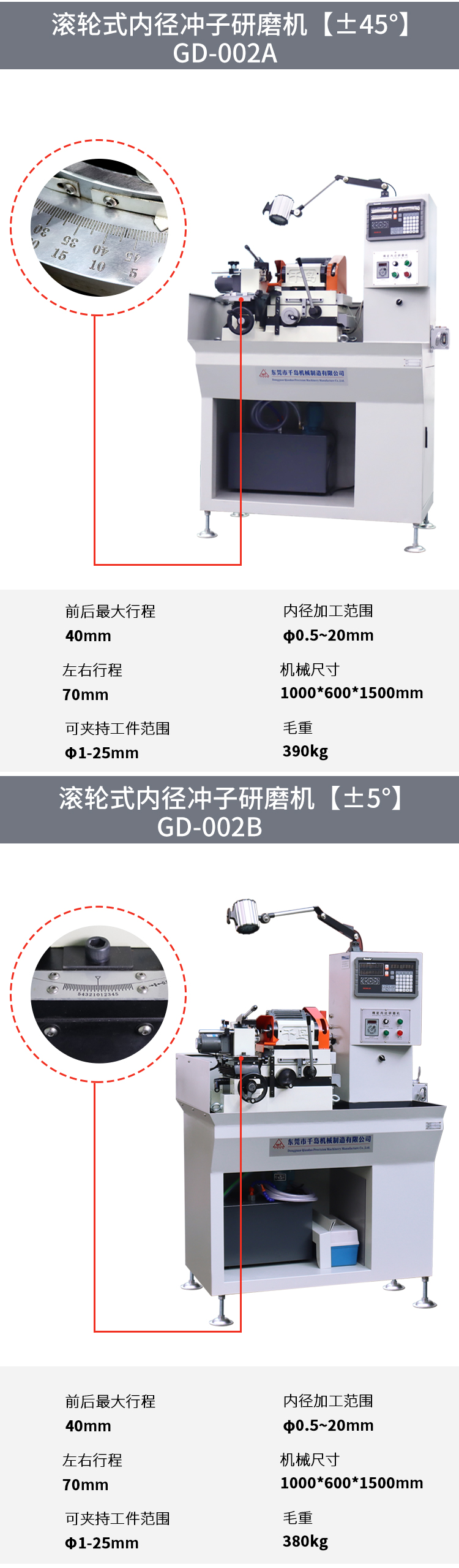 GD-001A滾輪式外徑?jīng)_子研磨機(jī)適用于沖頭、噴嘴、微小心軸、相關(guān)零組件微小外徑研磨。配置大角度(±45°)加工范圍更靈活。